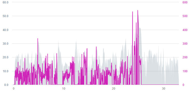 鎌倉一周の様子(グレー:速度、紫:パワー)。25km以降はパワーゼロで走っています。