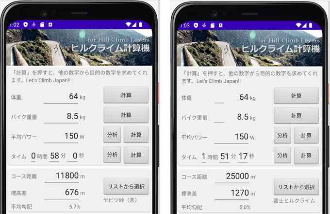 この数字(FTP=150W)に、重めの自転車(ROUBAIX=8.1kg、装備込みで8.5kg)、超重めの体重(64kg)を名作「ヒルクライム計算機」で計算してみると、こんな風になります(↓)