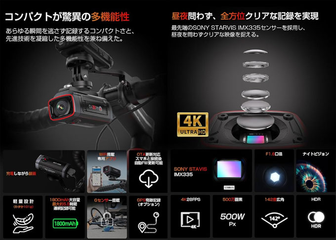 モデル名は例によって、「令和最新版・500万画素・あおり運転防止・UHD・4K・常時録画・ロードバイク用・・・・」と寿限無状態ので略しますが(AKY-710Sというみたいです)、まぁ、500万画素のドラレコです。