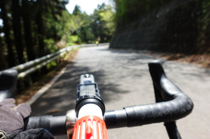 すぐに10%近い勾配が始まるのですが、ROUBAIX号は驚異の11-36Tという巨大なリアスプロケですので、難なくペダルを回せます。
