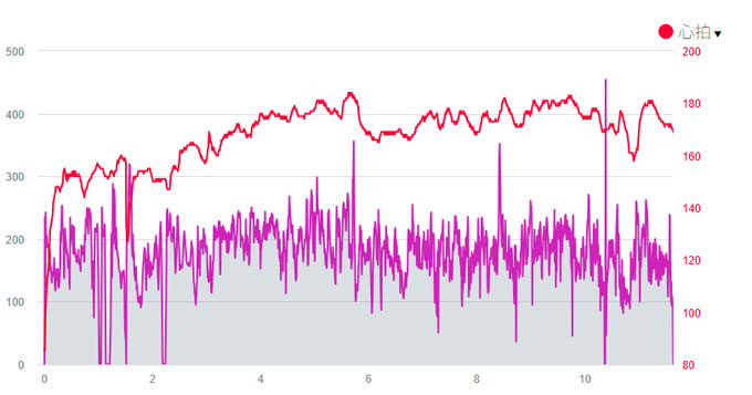 パワー&心拍グラフ。あと50bpmくらい出せるな(無理)